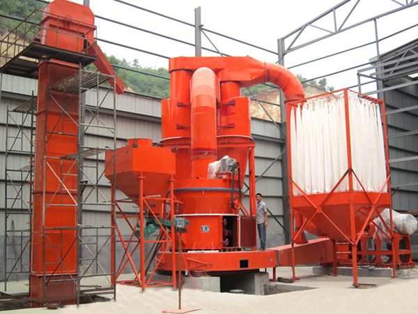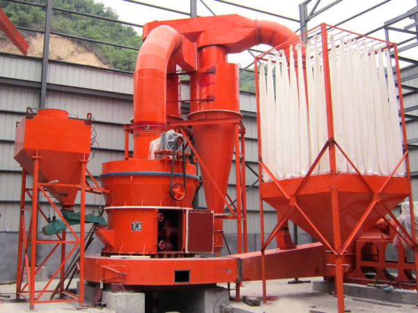 大塊狀物料經(jīng)鄂式破碎機(jī)破碎到所需粒度后,由提升機(jī)將物料送到料倉,再經(jīng)振動給料機(jī)將料均勻定量連續(xù)地送入主機(jī)磨室進(jìn)行研磨,粉磨后的粉子被風(fēng)機(jī)氣流帶走,經(jīng)分析機(jī)進(jìn)行分級。符合粒度要求的細(xì)粉隨氣流經(jīng)分析機(jī)進(jìn)入集粉器,通過集粉器下部的卸料閥排出即為成品;不符合粒度要求的粗粉被返回研磨室重新研磨。