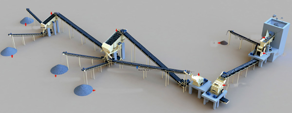 首先,骨料由給料機(jī)均勻地送進(jìn)顎式破碎機(jī)進(jìn)行初步破碎,然后,產(chǎn)成的粗料由輸送機(jī)輸送至反擊式破碎機(jī)進(jìn)行進(jìn)一步破碎,細(xì)碎后的骨料進(jìn)振動(dòng)篩篩分出不同規(guī)格的石子,不滿足粒度要求的骨料返料進(jìn)反擊式破碎機(jī)再次破碎,最終達(dá)到所需產(chǎn)品。